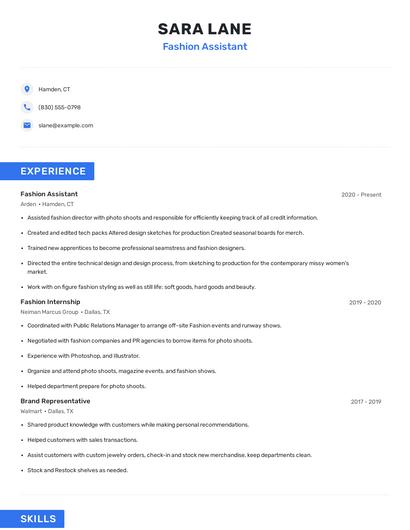You can use Zippia's AI resume builder to make the resume writing process easier while also making sure that you include key information that hiring managers expect to see on a fashion assistant resume. You'll find resume tips and examples of skills, responsibilities, and summaries, all provided by Zippi, your career sidekick.