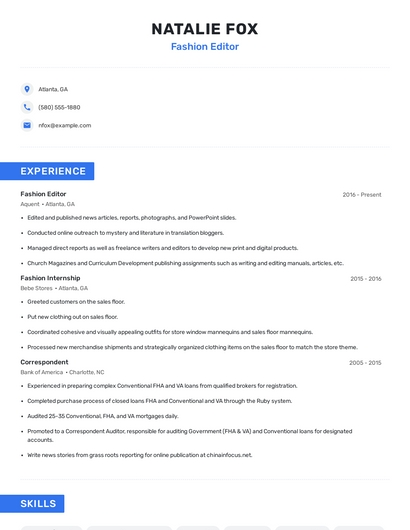 Build a professional fashion editor resume in minutes. Browse through our resume examples to identify the best way to word your resume. Then choose from 5+ resume templates to create your fashion editor resume.