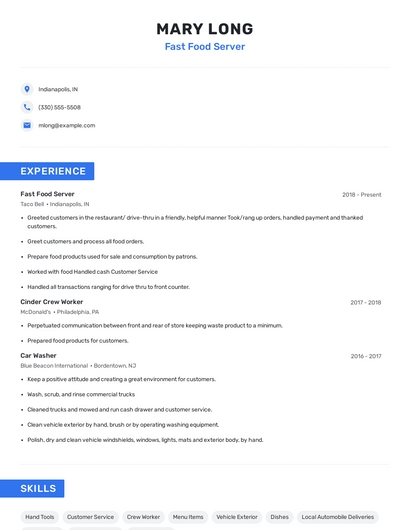 Build a professional fast food server resume in minutes. Browse through our resume examples to identify the best way to word your resume. Then choose from 5+ resume templates to create your fast food server resume.