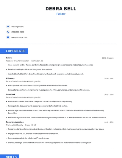 Build a professional fellow resume in minutes. Browse through our resume examples to identify the best way to word your resume. Then choose from 5+ resume templates to create your fellow resume.
