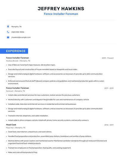 Build a professional fence installer foreman resume in minutes. Our AI resume writing assistant will guide you through every step of the process, and you can choose from 10+ resume templates to create your fence installer foreman resume.7. Diggers