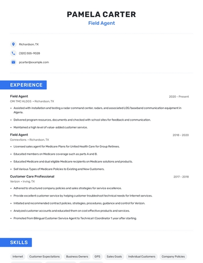 Build a professional field agent resume in minutes. Browse through our resume examples to identify the best way to word your resume. Then choose from 5+ resume templates to create your field agent resume.