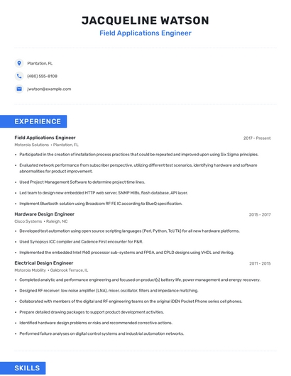 Build a professional field applications engineer resume in minutes. Browse through our resume examples to identify the best way to word your resume. Then choose from 5+ resume templates to create your field applications engineer resume.