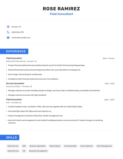 Build a professional field consultant resume in minutes. Browse through our resume examples to identify the best way to word your resume. Then choose from 5+ resume templates to create your field consultant resume.