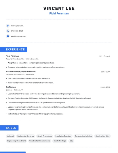 Build a professional field foreman resume in minutes. Browse through our resume examples to identify the best way to word your resume. Then choose from 5+ resume templates to create your field foreman resume.