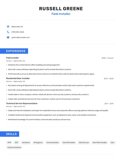 Build a professional field installer resume in minutes. Browse through our resume examples to identify the best way to word your resume. Then choose from 5+ resume templates to create your field installer resume.