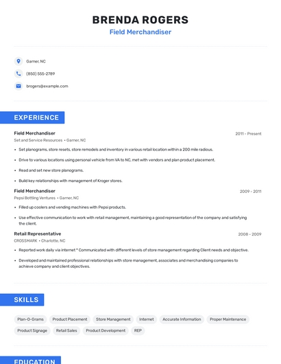 Build a professional field merchandiser resume in minutes. Browse through our resume examples to identify the best way to word your resume. Then choose from 5+ resume templates to create your field merchandiser resume.