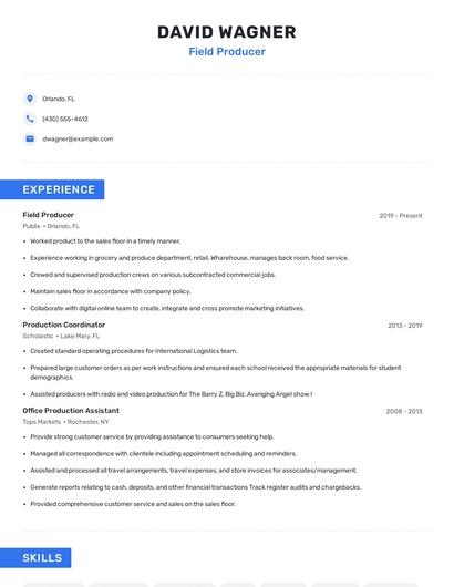 Build a professional field producer resume in minutes. Browse through our resume examples to identify the best way to word your resume. Then choose from 5+ resume templates to create your field producer resume.