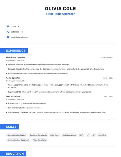 Build a professional field radio operator resume in minutes. Browse through our resume examples to identify the best way to word your resume. Then choose from 5+ resume templates to create your field radio operator resume.