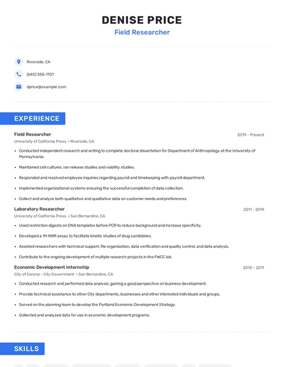 Build a professional field researcher resume in minutes. Browse through our resume examples to identify the best way to word your resume. Then choose from 5+ resume templates to create your field researcher resume.