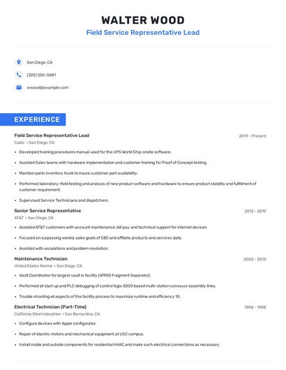 Build a professional field service representative lead resume in minutes. Browse through our resume examples to identify the best way to word your resume. Then choose from 5+ resume templates to create your field service representative lead resume.