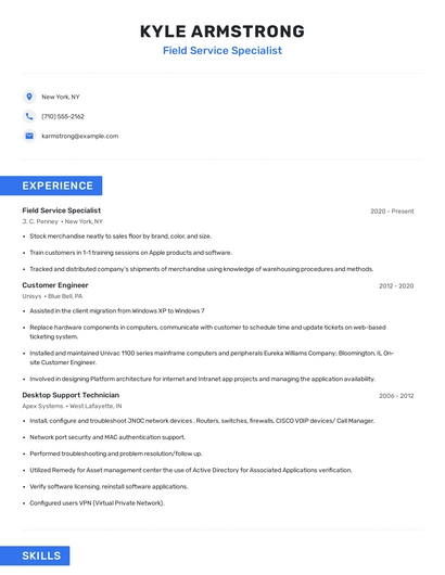 Build a professional field service specialist resume in minutes. Browse through our resume examples to identify the best way to word your resume. Then choose from 5+ resume templates to create your field service specialist resume.