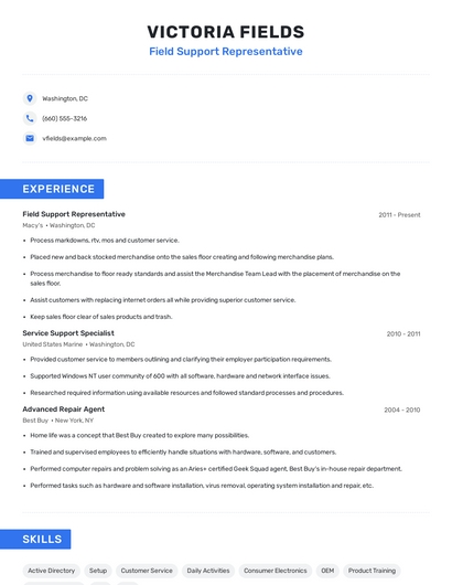 Build a professional field support representative resume in minutes. Browse through our resume examples to identify the best way to word your resume. Then choose from 5+ resume templates to create your field support representative resume.