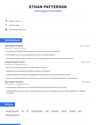 Build a professional field support technician resume in minutes. Browse through our resume examples to identify the best way to word your resume. Then choose from 5+ resume templates to create your field support technician resume.