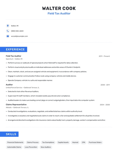 Build a professional field tax auditor resume in minutes. Browse through our resume examples to identify the best way to word your resume. Then choose from 5+ resume templates to create your field tax auditor resume.