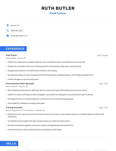 Build a professional field trainer resume in minutes. Browse through our resume examples to identify the best way to word your resume. Then choose from 5+ resume templates to create your field trainer resume.