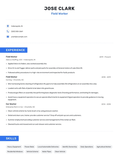 Build a professional field worker resume in minutes. Browse through our resume examples to identify the best way to word your resume. Then choose from 5+ resume templates to create your field worker resume.