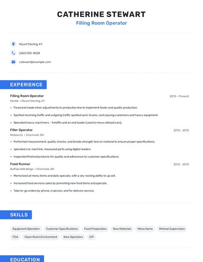 Build a professional filling room operator resume in minutes. Our AI resume writing assistant will guide you through every step of the process, and you can choose from 10+ resume templates to create your filling room operator resume.7. Safety Committee