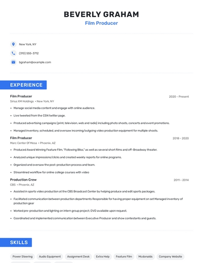 Build a professional film producer resume in minutes. Browse through our resume examples to identify the best way to word your resume. Then choose from 5+ resume templates to create your film producer resume.