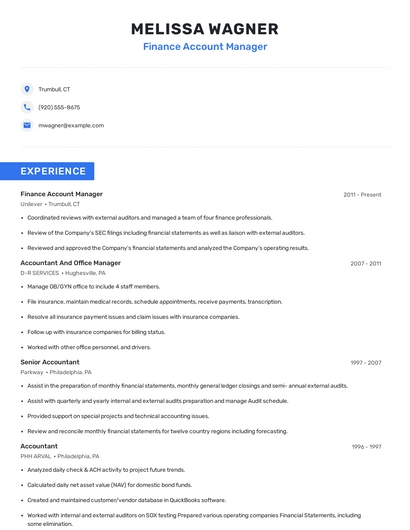 Build a professional finance account manager resume in minutes. Browse through our resume examples to identify the best way to word your resume. Then choose from 5+ resume templates to create your finance account manager resume.