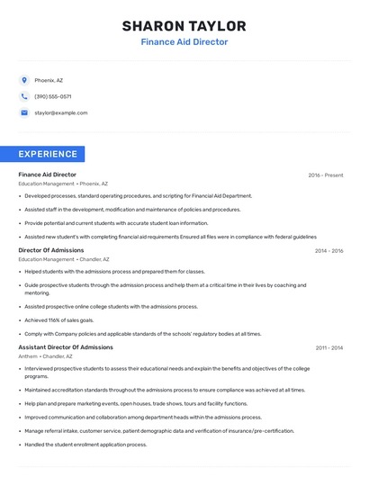 Build a professional finance aid director resume in minutes. Browse through our resume examples to identify the best way to word your resume. Then choose from 5+ resume templates to create your finance aid director resume.