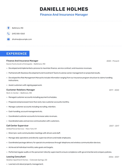 Build a professional finance and insurance manager resume in minutes. Browse through our resume examples to identify the best way to word your resume. Then choose from 5+ resume templates to create your finance and insurance manager resume.