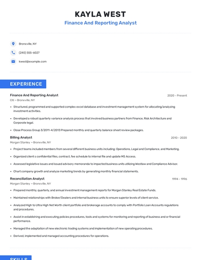 Build a professional finance and reporting analyst resume in minutes. Browse through our resume examples to identify the best way to word your resume. Then choose from 5+ resume templates to create your finance and reporting analyst resume.