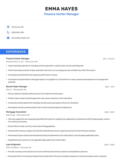 Build a professional finance center manager resume in minutes. Browse through our resume examples to identify the best way to word your resume. Then choose from 5+ resume templates to create your finance center manager resume.