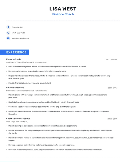 Build a professional finance coach resume in minutes. Browse through our resume examples to identify the best way to word your resume. Then choose from 5+ resume templates to create your finance coach resume.
