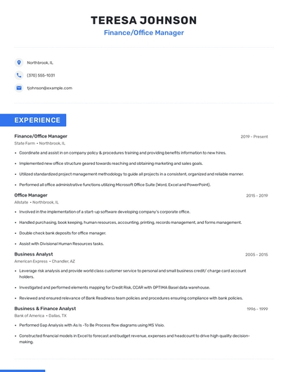 Build a professional finance/office manager resume in minutes. Browse through our resume examples to identify the best way to word your resume. Then choose from 5+ resume templates to create your finance/office manager resume.