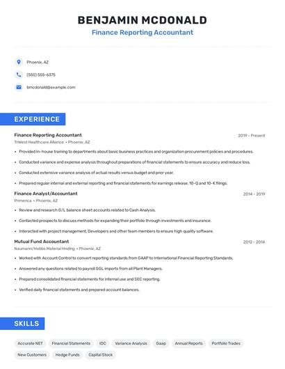 Build a professional finance reporting accountant resume in minutes. Browse through our resume examples to identify the best way to word your resume. Then choose from 5+ resume templates to create your finance reporting accountant resume.