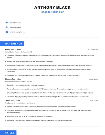Build a professional finance technician resume in minutes. Browse through our resume examples to identify the best way to word your resume. Then choose from 5+ resume templates to create your finance technician resume.