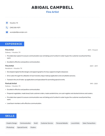 Build a professional fine artist resume in minutes. Browse through our resume examples to identify the best way to word your resume. Then choose from 5+ resume templates to create your fine artist resume.