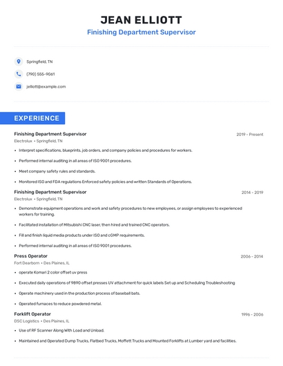 Build a professional finishing department supervisor resume in minutes. Our AI resume writing assistant will guide you through every step of the process, and you can choose from 10+ resume templates to create your finishing department supervisor resume.7. RAN