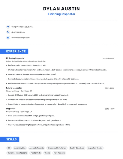 Build a professional finishing inspector resume in minutes. Browse through our resume examples to identify the best way to word your resume. Then choose from 5+ resume templates to create your finishing inspector resume.