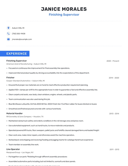 Build a professional finishing supervisor resume in minutes. Browse through our resume examples to identify the best way to word your resume. Then choose from 5+ resume templates to create your finishing supervisor resume.
