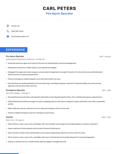 Build a professional fire alarm operator resume in minutes. Our AI resume writing assistant will guide you through every step of the process, and you can choose from 10+ resume templates to create your fire alarm operator resume.7. Emergency Scenes