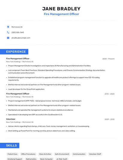 Build a professional fire management officer resume in minutes. Browse through our resume examples to identify the best way to word your resume. Then choose from 5+ resume templates to create your fire management officer resume.