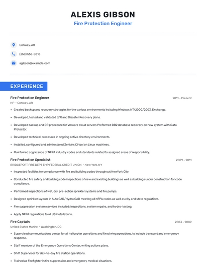 Build a professional fire protection engineer resume in minutes. Browse through our resume examples to identify the best way to word your resume. Then choose from 5+ resume templates to create your fire protection engineer resume.