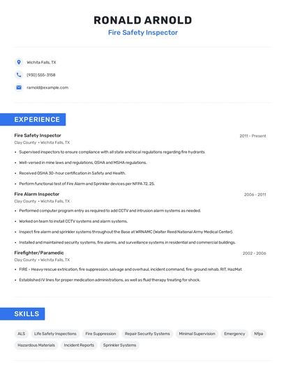 Build a professional fire safety inspector resume in minutes. Browse through our resume examples to identify the best way to word your resume. Then choose from 5+ resume templates to create your fire safety inspector resume.