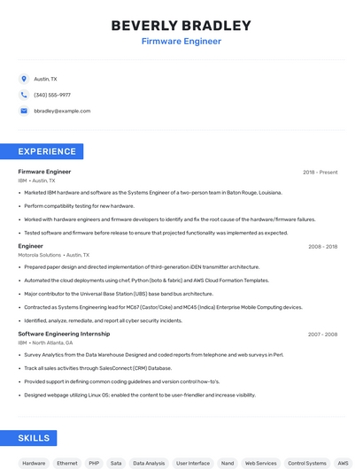 Build a professional firmware engineer resume in minutes. Browse through our resume examples to identify the best way to word your resume. Then choose from 5+ resume templates to create your firmware engineer resume.