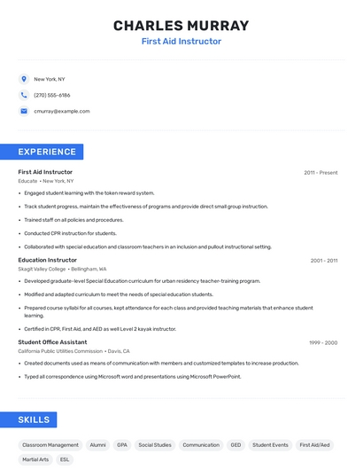 Build a professional first aid instructor resume in minutes. Browse through our resume examples to identify the best way to word your resume. Then choose from 5+ resume templates to create your first aid instructor resume.