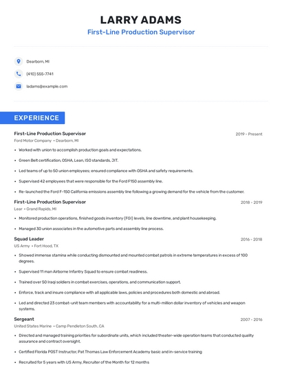 Build a professional first-line production supervisor resume in minutes. Browse through our resume examples to identify the best way to word your resume. Then choose from 5+ resume templates to create your first-line production supervisor resume.
