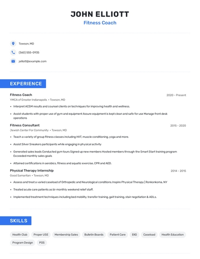 Build a professional fitness coach resume in minutes. Browse through our resume examples to identify the best way to word your resume. Then choose from 5+ resume templates to create your fitness coach resume.