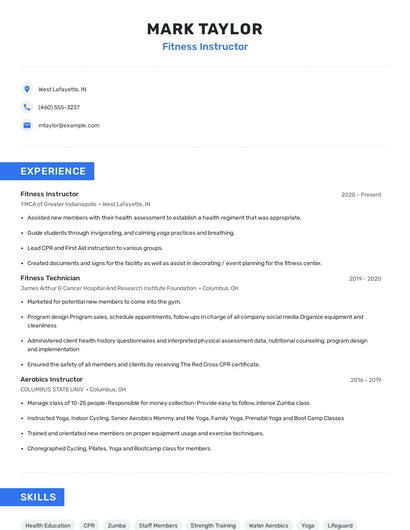 Build a professional fitness instructor resume in minutes. Browse through our resume examples to identify the best way to word your resume. Then choose from 5+ resume templates to create your fitness instructor resume.