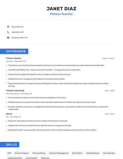 The most important skills for a fitness teacher resume and required skills for a fitness teacher to have include: