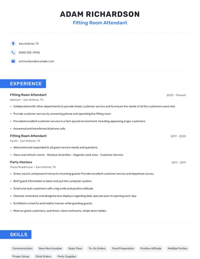 Build a professional fitting room attendant resume in minutes. Browse through our resume examples to identify the best way to word your resume. Then choose from 5+ resume templates to create your fitting room attendant resume.