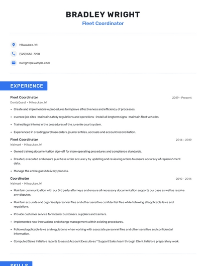 Build a professional fleet coordinator resume in minutes. Browse through our resume examples to identify the best way to word your resume. Then choose from 5+ resume templates to create your fleet coordinator resume.