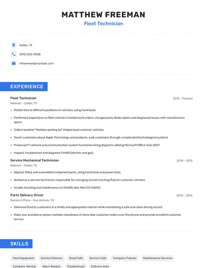 Build a professional fleet technician resume in minutes. Browse through our resume examples to identify the best way to word your resume. Then choose from 5+ resume templates to create your fleet technician resume.