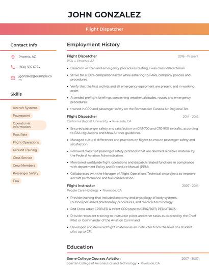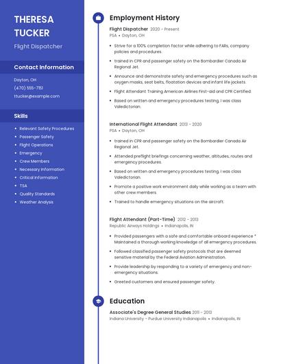 You can use Zippia's AI resume builder to make the resume writing process easier while also making sure that you include key information that hiring managers expect to see on a flight dispatcher resume. You'll find resume tips and examples of skills, responsibilities, and summaries, all provided by Zippi, your career sidekick.